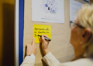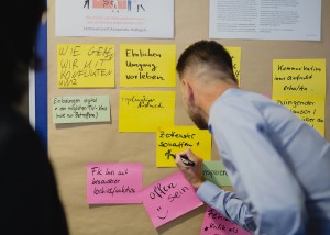 Im zweiten Schritt üben wir mit den Führungskräften die „Leibilddialoge“ ein. Dafür arbeiten wir in Kleingruppen gemeinsam in einem Raum, die, angeleitet durch zwei Moderantor*innen, alle Schritte exemplarisch durchlaufen und damit selbst in der Rolle der Teilnehmenden erfahren, wie die Leitbilddialoge funktionieren.